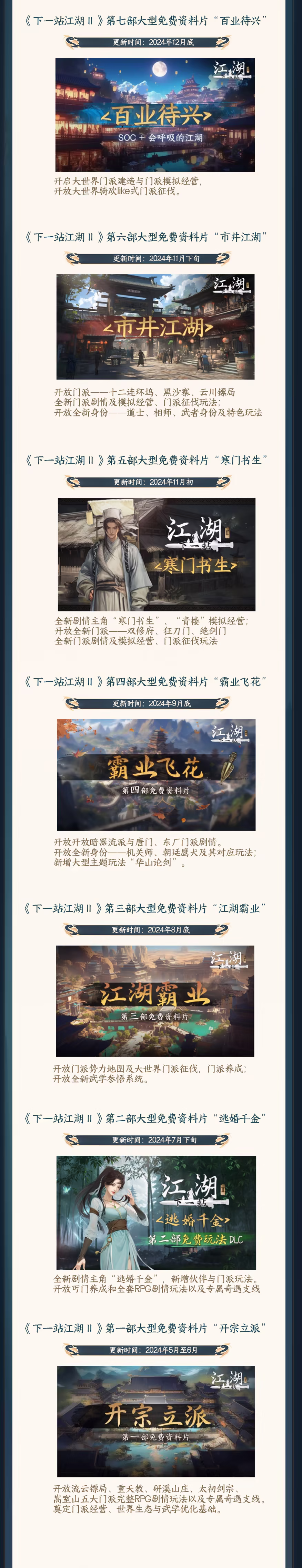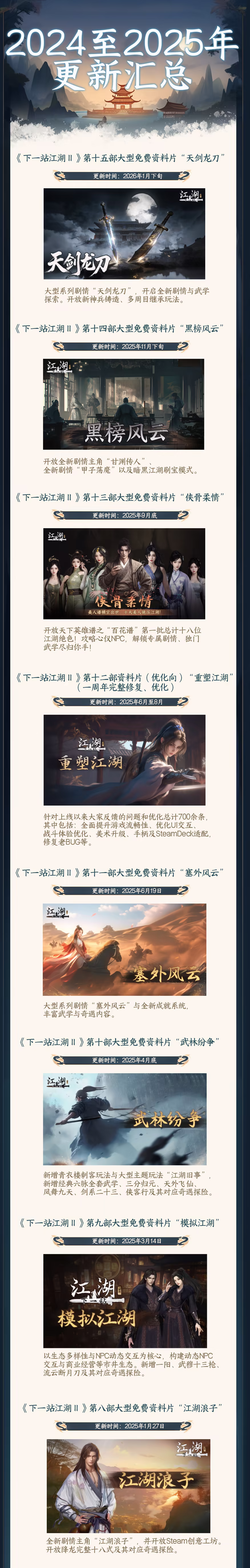 庞大内容、及时更新:上线迄今已超过百更、八部大型玩法资料片!2025年我们将继续砥砺前行,用更多更好玩的内容来填充这个江湖大世界!