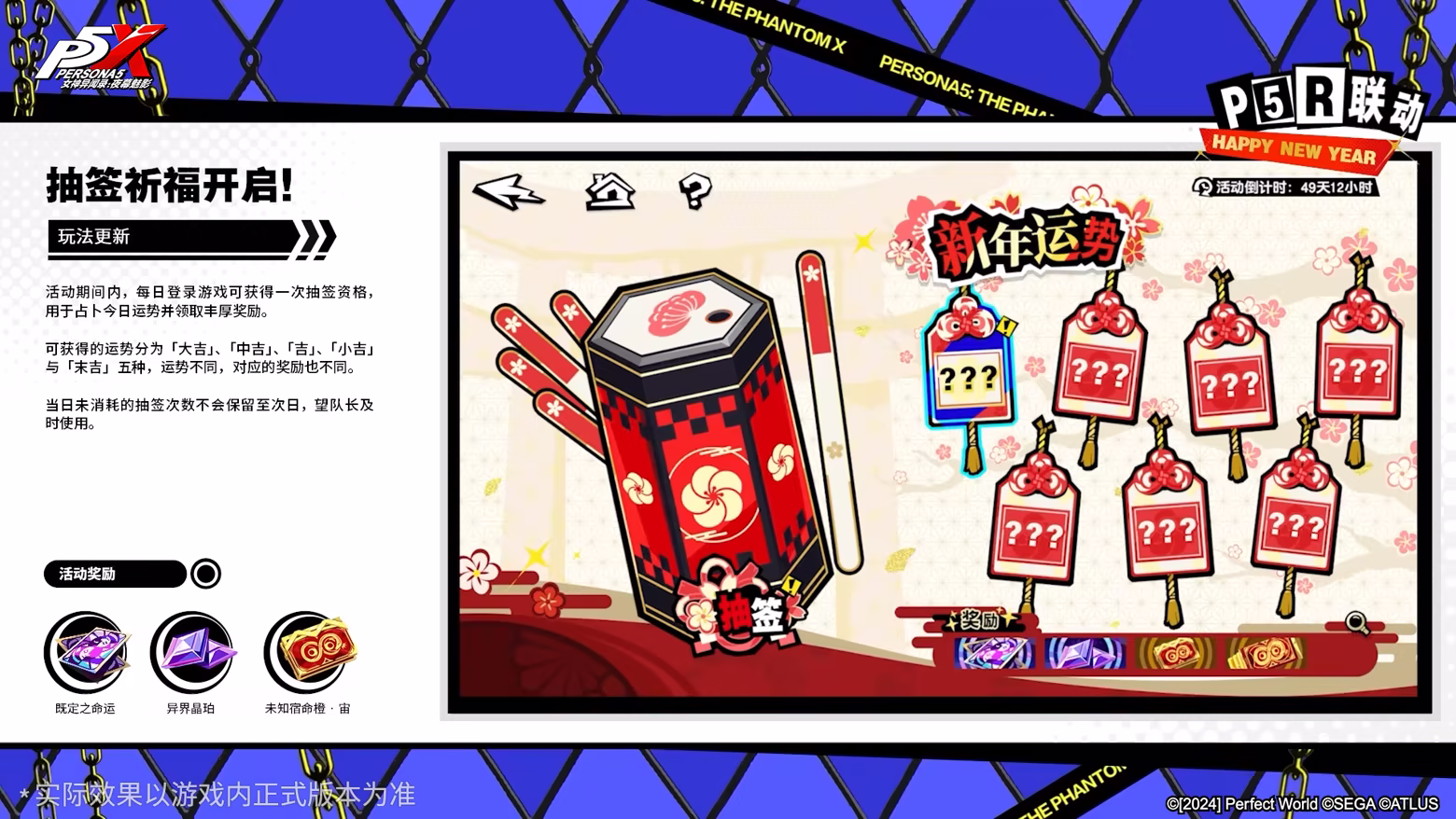 可获得的运势分为「大吉」、「中吉」、「吉」、「小吉」与「末吉」五种,运势不同,对应的奖励也不同。